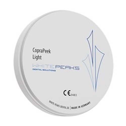 • The very high biocompatibility of this high tech resin makes it the first choice for prosthetic bases, constructions, metal free supra-structures as well as crown and bridge restorations. Available in the shades “Medium“ (like dentin A2), “Light“ (light grey), “Rose“ (gum shade) and the natural colour of PEEK “Bio Classic“. CopraPeek is very plaque resistant, non-allergenic and tasteless.