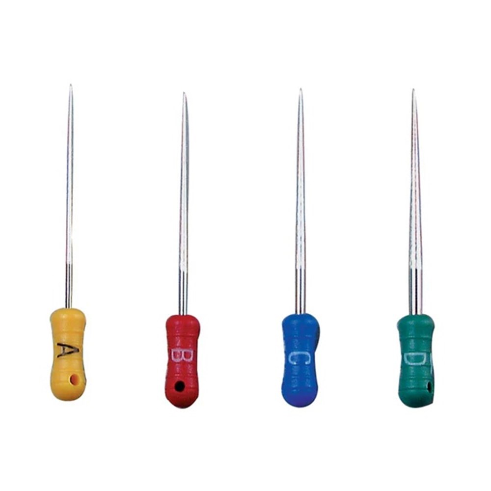 Used to condense and spread gutta percha in a root-canal procedure. Features 4 sizes (A, B, C, and D) and color-coded handles for easier size identification. Stainless steel tips.