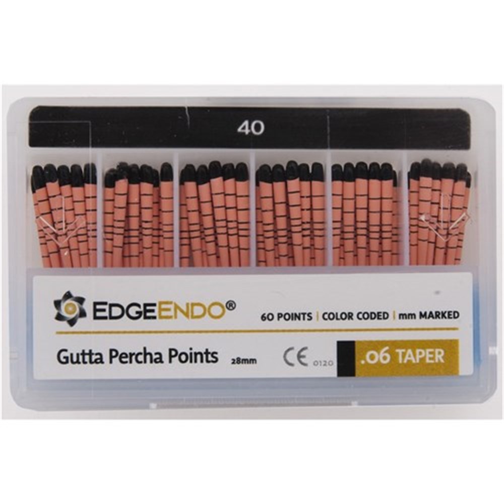 Our Edge Gutta Percha Points are time saving with easy filling because they complement each of our file systems. They come in all the standard sizes needed, from 15 to 50 in .04 and .06 taper. Points are standard length: 29mm +/-1 and include length markings for easier root canal obturation. Each box comes with 60 gutta percha points that have excellent radiopacity.