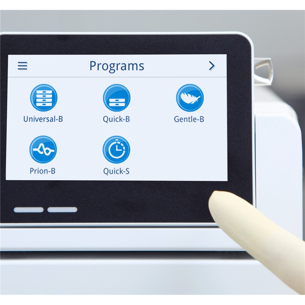 • Powerful class B vacuum process: Reliable sterilization of up to 6 kg on 5 trays in only 16 to 31 minutes (plus timed drying).
