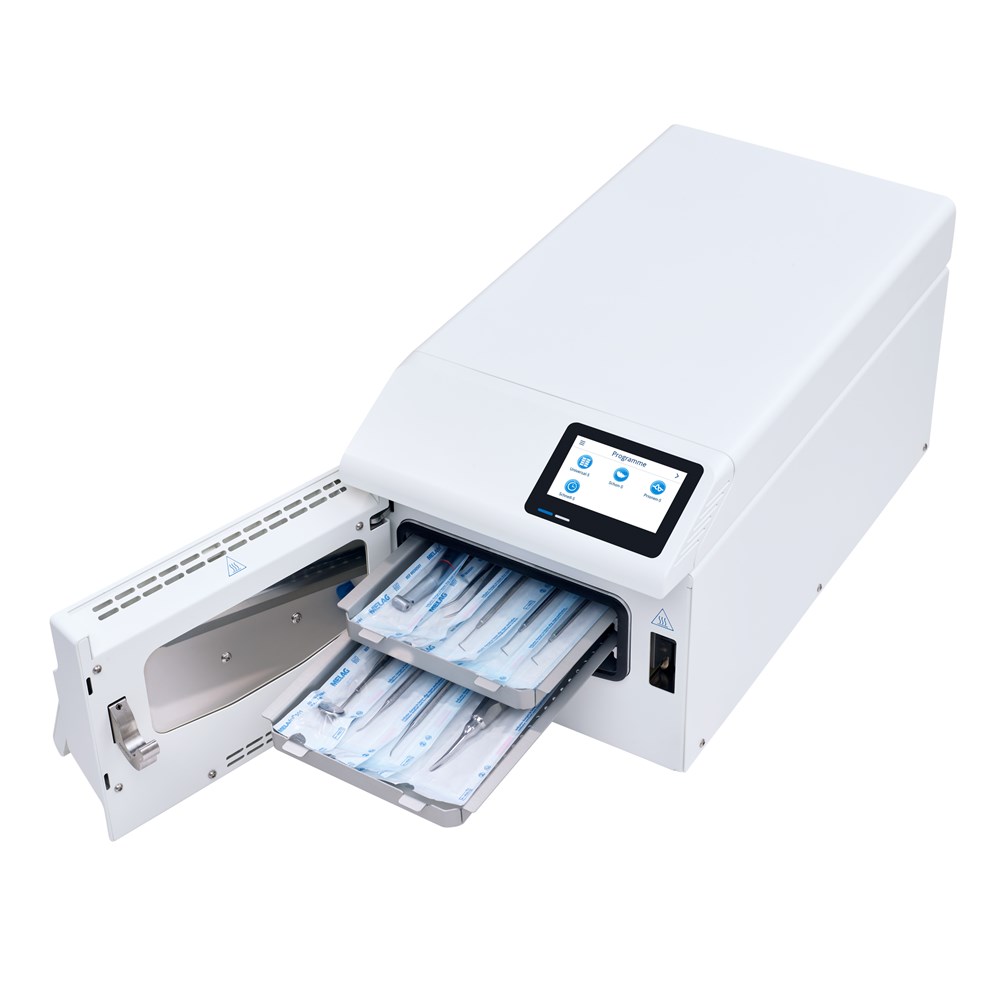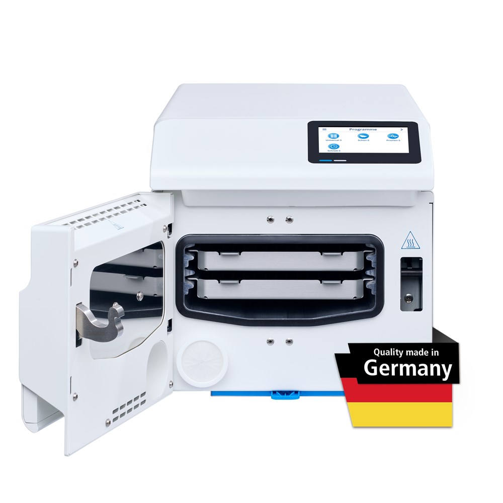 With a chamber size of 5 liters and a device width of only 30 cm, the world's fastest autoclave fits into any reprocessing line: Either as a supplement to your conventional autoclave for lightning-fast sterilization between treatments or as a stand-alone device for lower instrument volumes.
