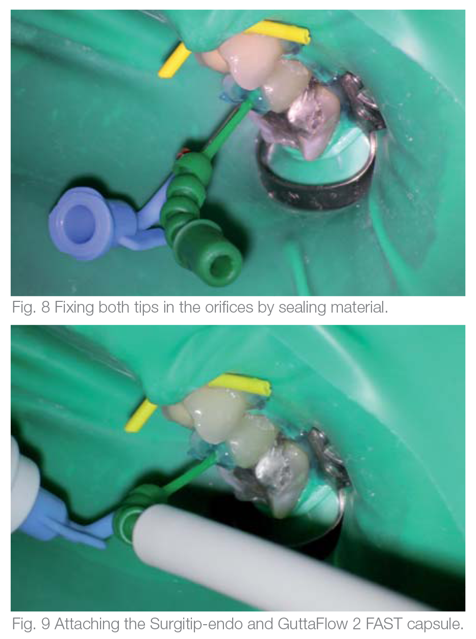 This special filling system was created with the use of the Surgitip-endo and the tight seal material GuttaFlow 2 (Fig. 7). This filling material combines cold free-flow gutta-percha and a sealer creating an easy to handle, fast flowing filling material, which has been proven as a reliable barrier against bacteria and liquids re-entering the root canal. Its working time takes approximately ten to fifteen minutes. Before the actual procedure starts, it is necessary to fix both the Surgitip-endo front part as well as the CanalTip of the GuttaFlow capsules at the entrance of both canals. Both the front part of Surgitipendo and a canal tip are firmly fixed in the different orifices by a sealing material that is polymerised for approximately 10 seconds (Fig. 8). The seal at the canal entrance works as a temporary cap to enable the establishment of negative pressure underneath it with the aid of the aspirating tip. With this special trick a negative pressure zone can be created, which allows literally to pull the gutta-percha filling material into smaller lateral canals and ramifications that were hardly detectable in the anamnesis before.