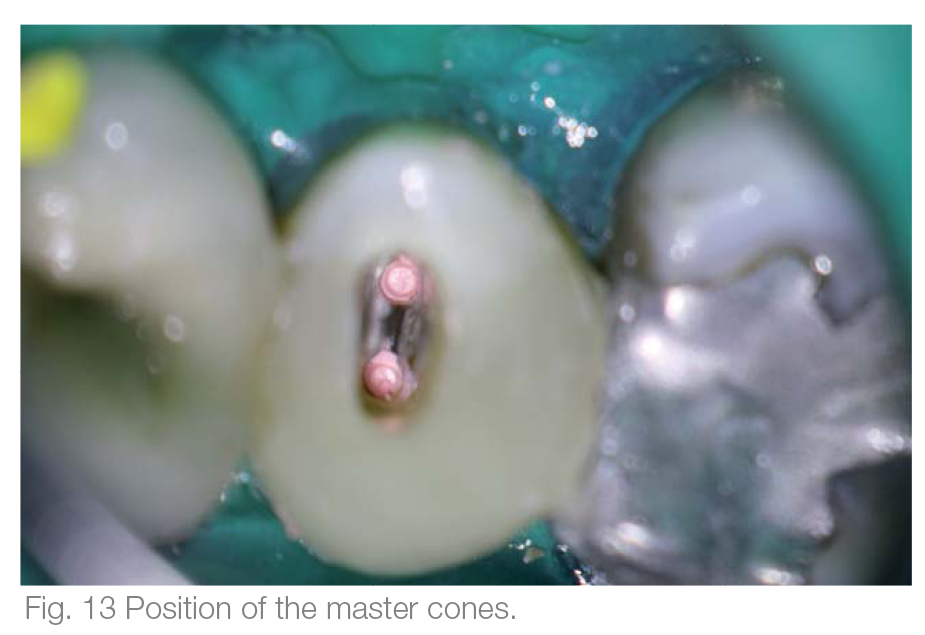 Now a GuttaFlow 2 FAST capsule was attached to the CanalTip as well as the Surgitip-endo to its front part (Fig. 9). While the air was sucked off with the Surgitip-endo above the filling, the guttapercha material was released into the canal system simultaneously and quickly spread into the prepared root canal system. In general, the innovative design of the suction tip ensures unrestricted high suction performance at all angles, therefore the gutta-percha was evenly distributed and filled the confluent canals within seconds. Complete control of the material extrusion was consequently achieved (Fig. 10). After the injected GuttaFlow 2 had reached the Surgitipendo, the temporary sealing material could be removed. The rest of the GuttaFlow 2 capsule was used for a classic backfill and the pre-fitted master cones were very slowly seated in place (Figs. 11–13).