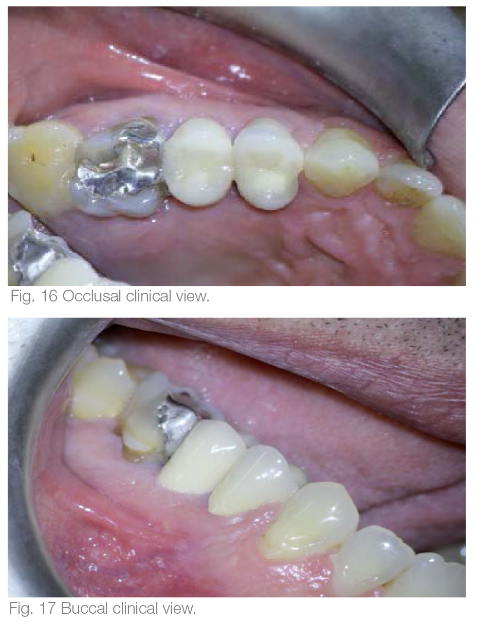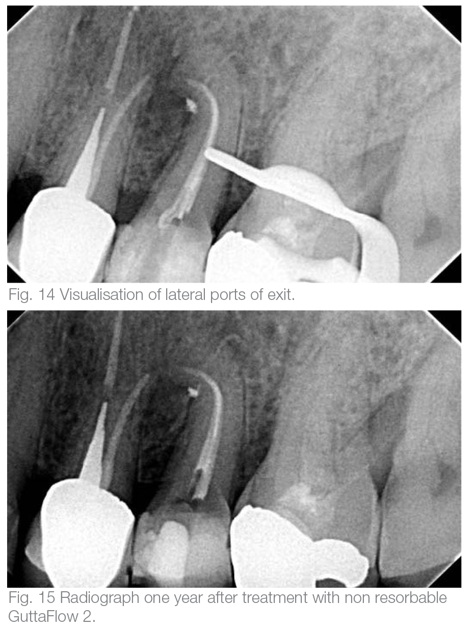 The tooth was restored with a fiber post, a composite built up and a PFM crown. In the final radiographic image of the tooth right after the RCT, the lateral ports of exit could be visualised (Fig. 14). One year after the treatment, the follow-up radiograph revealed complete healing. The nonabsorbable GuttaFlow 2 could be detected unaltered in the lateral portals of exit (Fig. 15). The buccal and occlusal clinical view of the tooth and soft tissues can be seen in Figures 16 and 17.