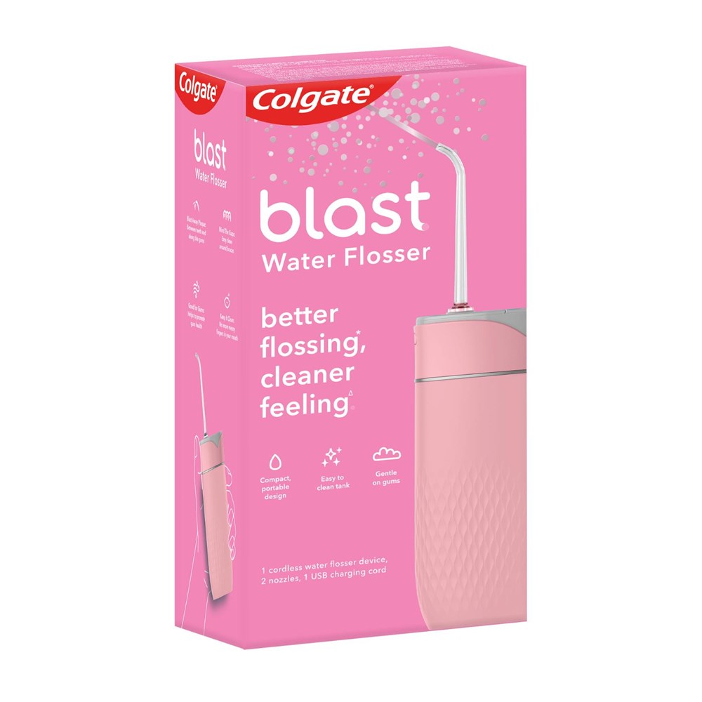 Box contains: 1x Colgate Blast Cordless Water Flosser Device, 2x Nozzles, 1x USB Charging Cord