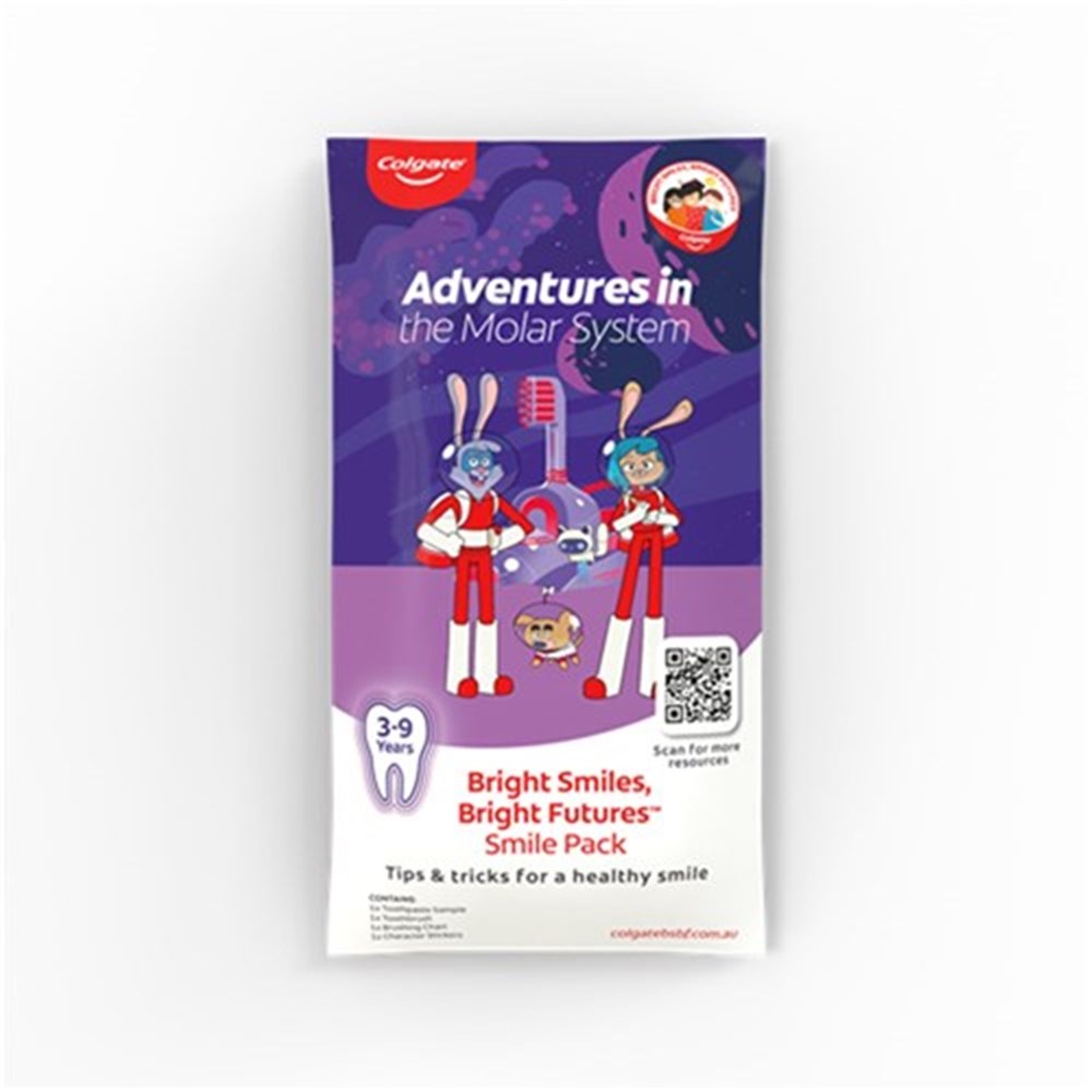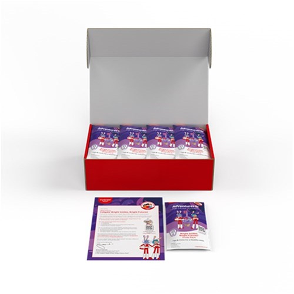 30 x Individual Smile Packs, designed for distribution to children to encourage at-home oral care. Each Smile Pack includes: