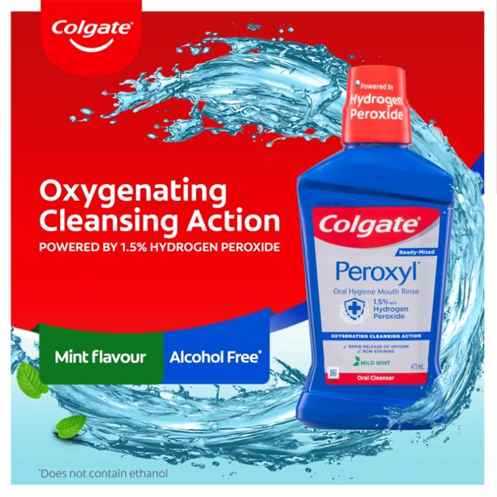 Colgate Peroxyl Oral Hygiene Mouth Rinse Mouthwash Mild Mint is a ready-mixed oral cleanser with oxygenating cleansing action. Rapid release of oxygen and non-staining. Alcohol free (does not contain ethanol). Oxygenating cleansing action powered by 1.5% w/v Hydrogen Peroxide.