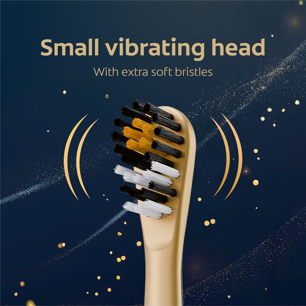 - Small vibrating head with extra soft bristles: cleaning teeth by gently sweeping away plaque
