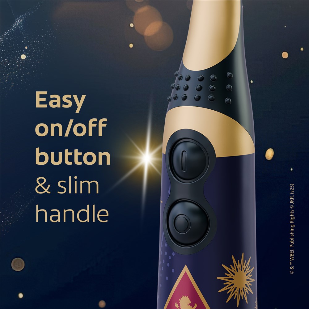 The Colgate Kids Powered Extra Soft Toothbrush provides a magical clean for young witches and wizards. It brushes away more plaque* (*vs a manual toothbrush), has a slim handle, easy on/off buttons and a small vibrating head with extra soft bristles, cleaning teeth by gently sweeping away plaque.