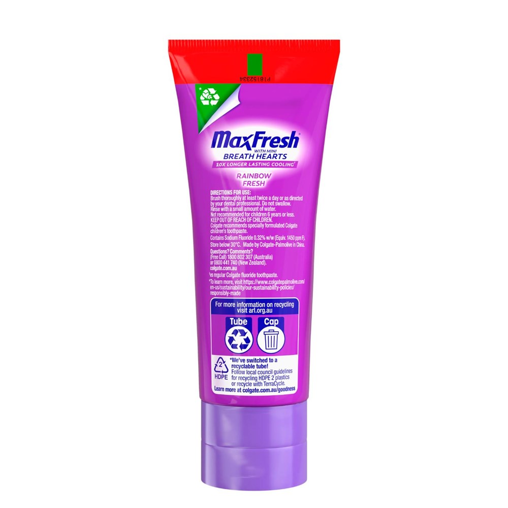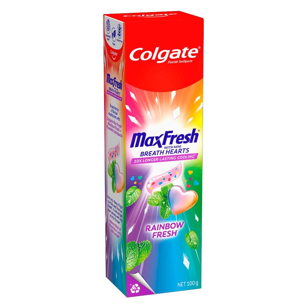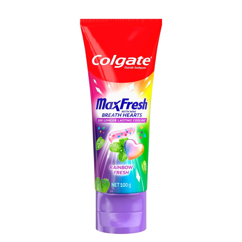 Experience a flavour explosion with Colgate Max Fresh Rainbow Fresh toothpaste. This fluoride toothpaste features mini breath hearts for long-lasting freshness. Not only does it fight cavities, clean teeth and freshen breath, it will delight your senses and make brushing feel more enjoyable! Freshness that lasts for hours.